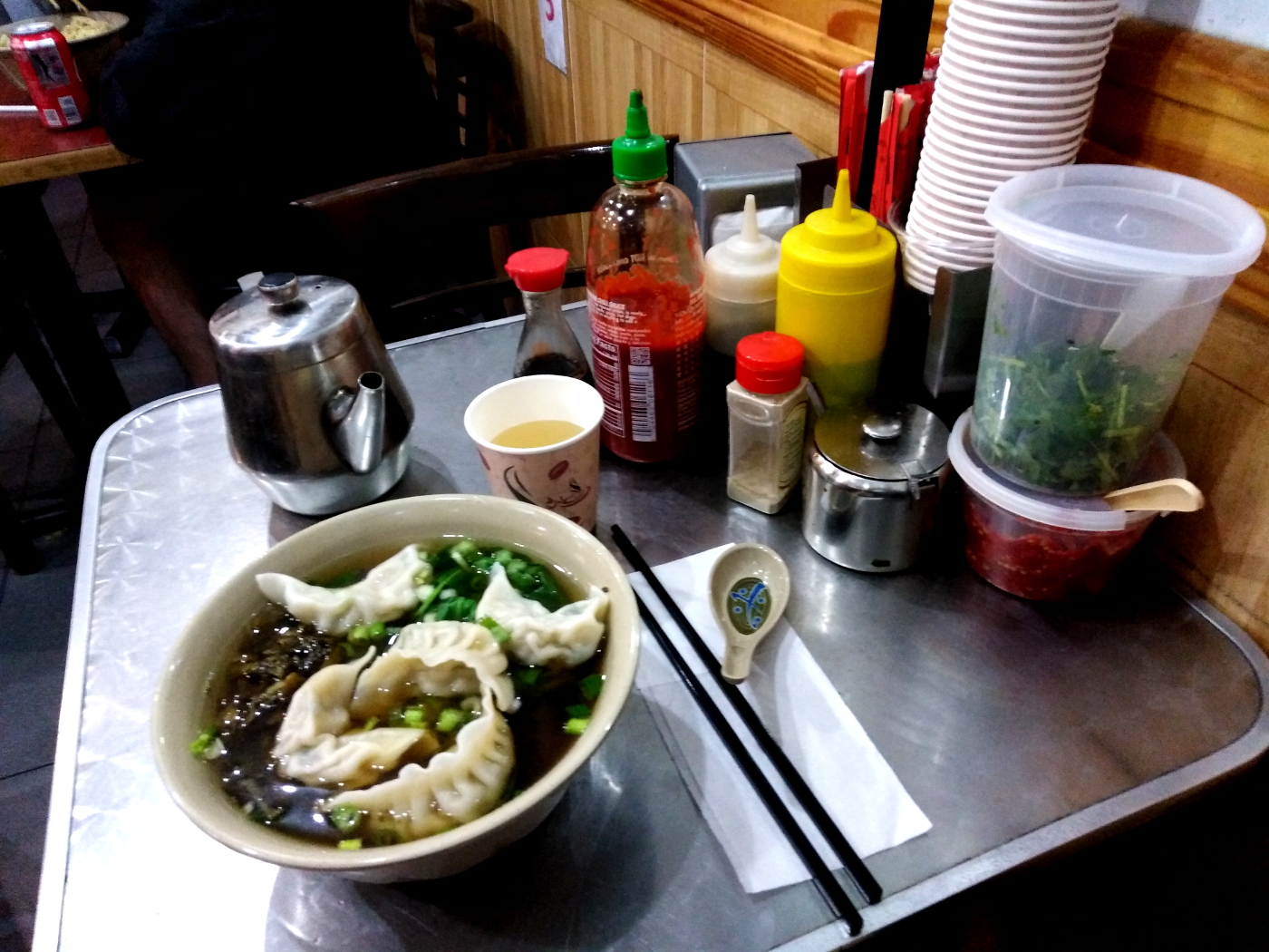 Wer – wie ich – nicht sonderlich experimentierfreudig ist, dem sei das Tasty Hand-Pulled Noodles wärmstens empfohlen. Das Essen ist wirklich ausgezeichnet und günstig (z.B. Beef Noodle Soup für 7,50 $, Vegetable Noodle Soup für 7,00 $ und für die Mutigen unter euch Eel Noodle Soup für 10,00 $) und es gibt eine nicht zu verachtende Auswahl an vegetarischen Speisen; die Nudeln sind, der Name verrät es, hausgemacht. Der Laden ist sehr klein, es gibt kaum 20 Sitzplätze, die Tische sind zugestellt mit allerlei Saucen, Kräutern und Gewürzen, die Gäste bekommen sofort eine Kanne Tee aufs Haus spendiert und WLAN gibt es obendrein (Passwort hängt neben der Toilette). Herrlich unprätentiös!